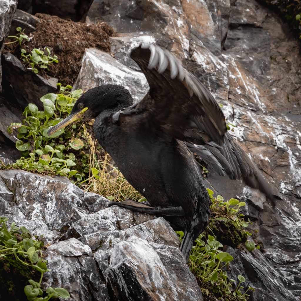 Við náðum að fóta okkur á lítilli syllu en með herkjum þó. Í ánni fyrir neðan okkur var skarfurinn enn á fullu stími, stefndi beint á klettinn en tók svo ógnandi 180º snúning og hvarf aftur út í hylinn, enn á kafi. Við bröltum í land til að ná áttum, lafmóðir. Eftir nokkur augnablik sem þó virtust heil eilífð kom skarfurinn upp á yfirborðið við bakkann fjær og hann var ekki einn — heldur með vænan sjóbirting í goggnum. Fullkomin ferð: Búinn að losa sig við samkeppnina – hafi hún verið nokkur – og ná sér í vænan fisk í leiðinni.